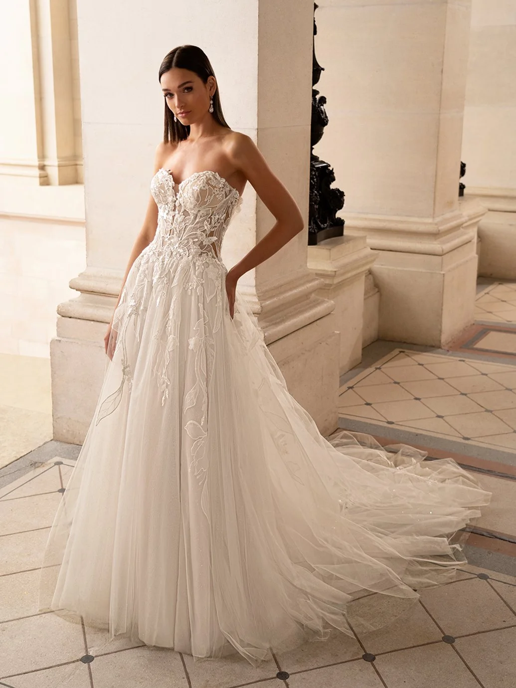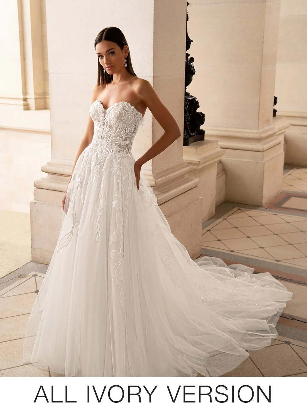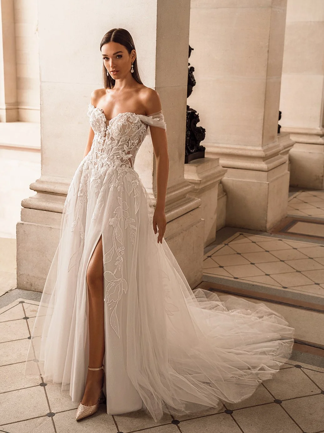 FAE is perfect for your fairytale wedding! This graceful A-line gown exudes an ethereal and romantic charm with its detachable off-the-shoulder straps, organza floral embroidered lace, and beaded floral appliques cascading from the bodice onto the soft, glittery tulle skirt with a sexy slit. The tulle corset back adds a touch of femininity and glamour to this beautiful gown.