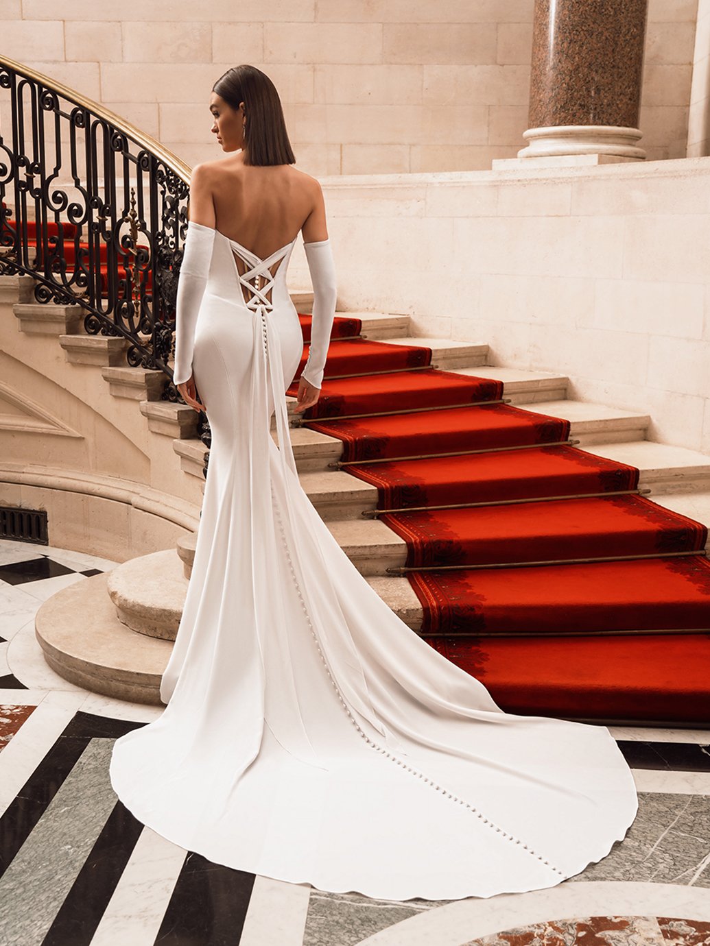 Bring out your inner goddess as you walk down the aisle in Fifi! This jaw-dropping chiffon and stretch georgette sheath gown features a stunning draped bodice with exposed corset boning and an eye-catching tulle corset back. The artful draping down to the sleek skirt paired with the matching long sleeves adds an extra dose of luxury to this modern bridal look.
