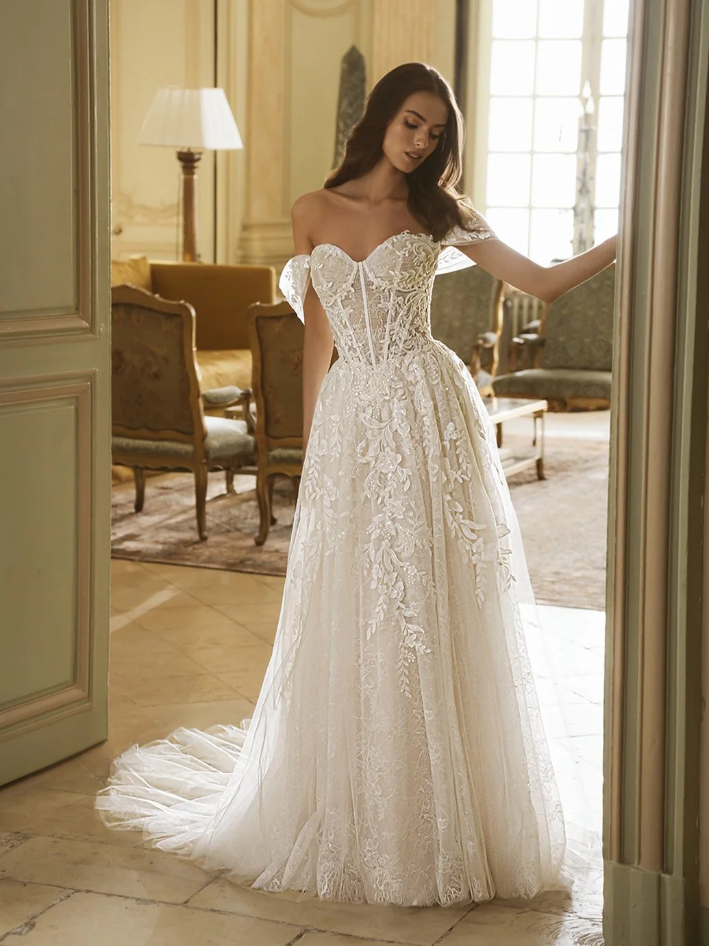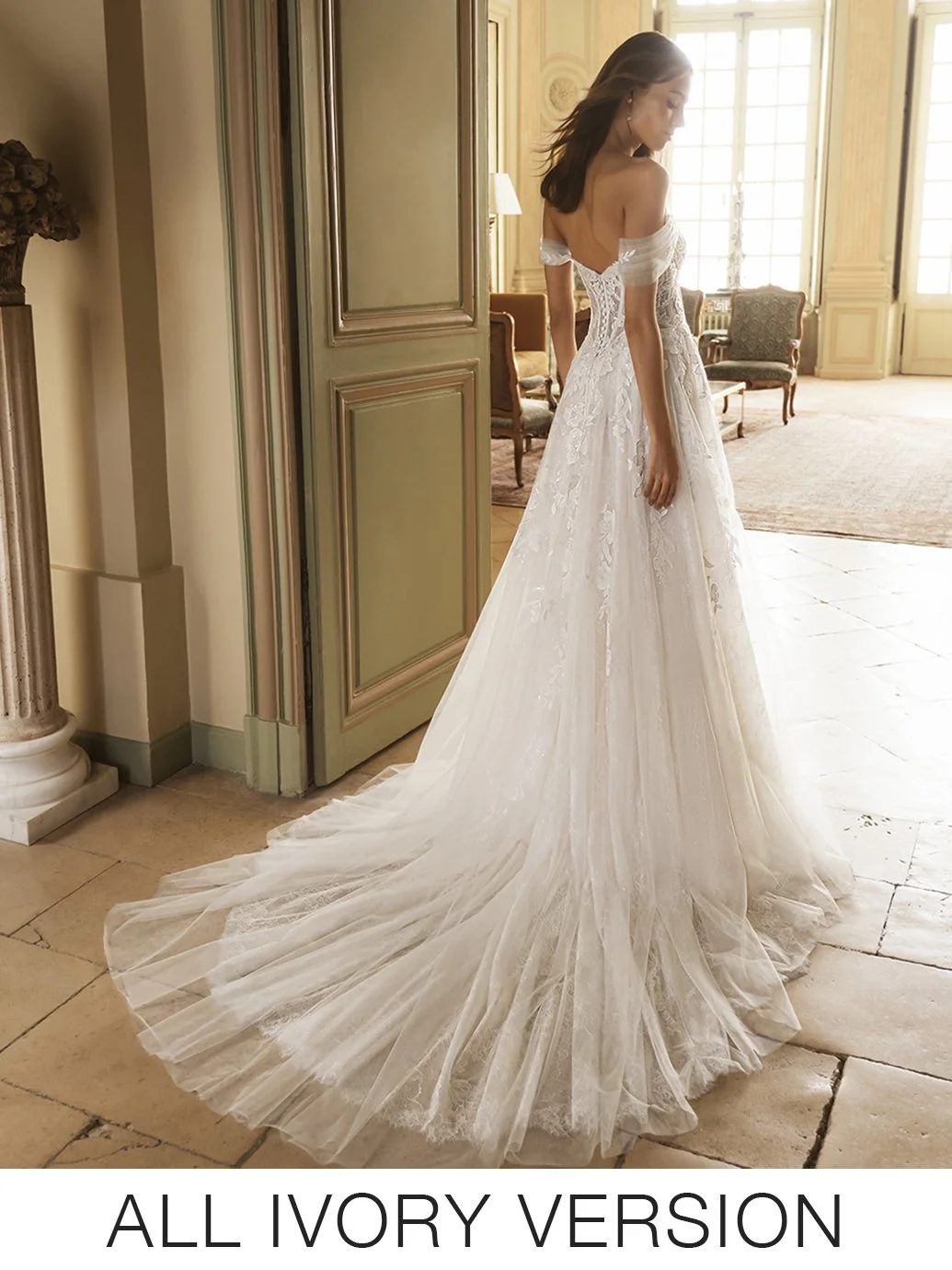 Introducing the enchanting Gail wedding gown from the Élysée collection. Crafted in ethereal baroque lace and dreamy tulle, its A-line silhouette is a vision of whimsical romance. The sweetheart neckline and sculptural exposed boning corset back exude sophistication, while detachable off-shoulder straps add a playful touch.