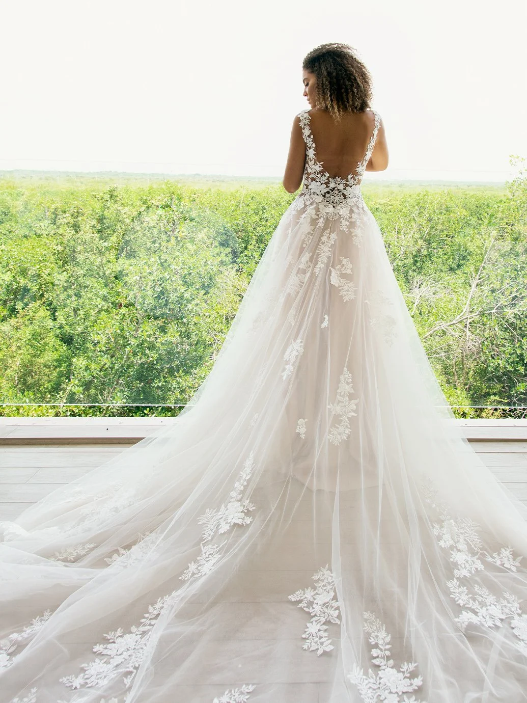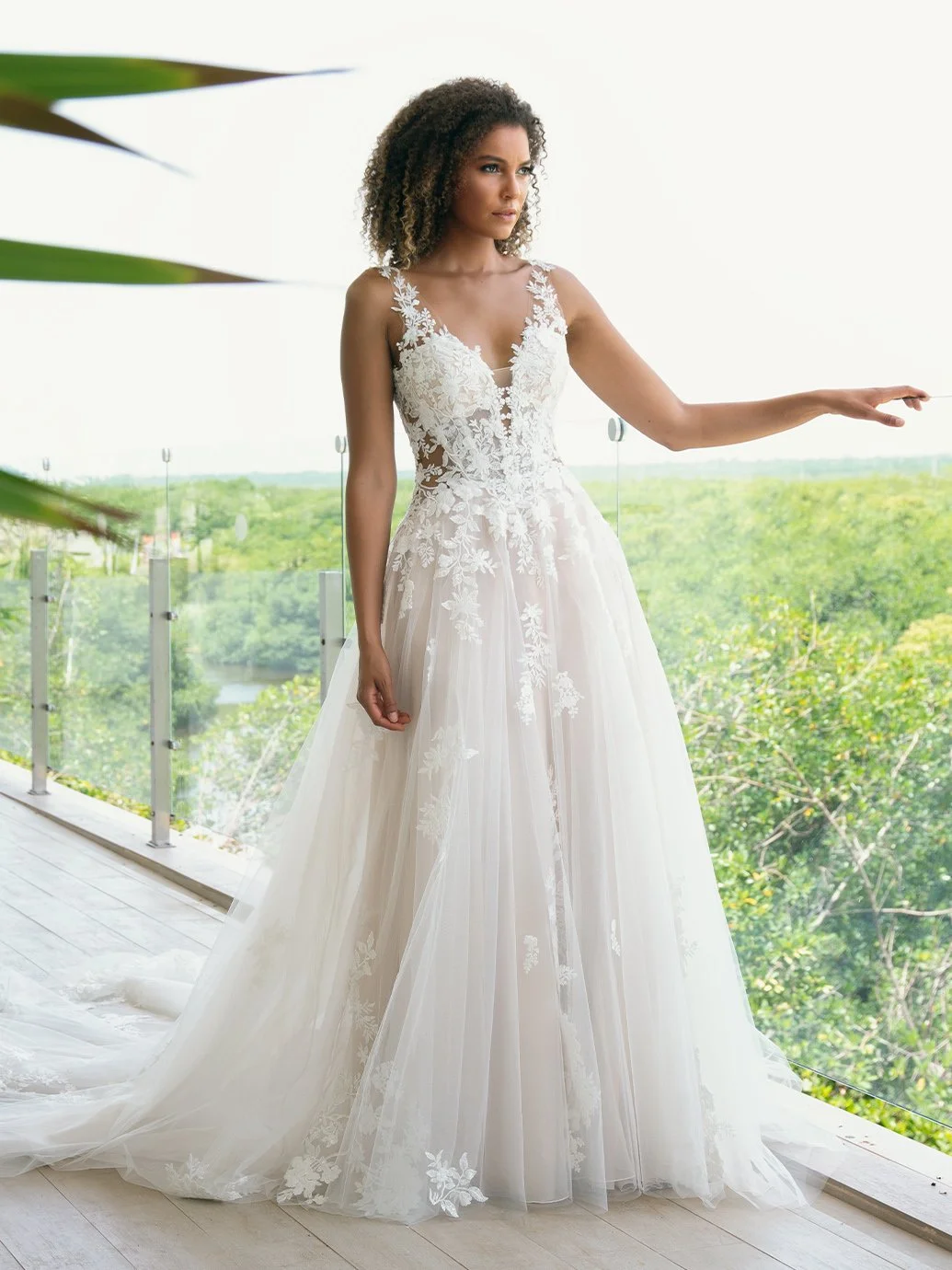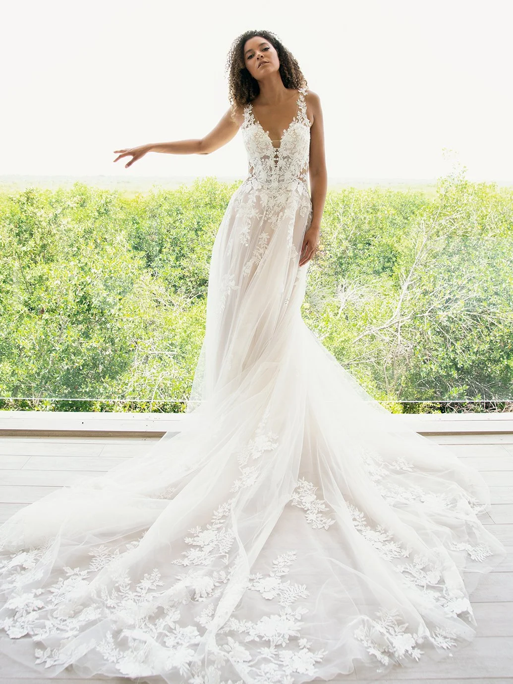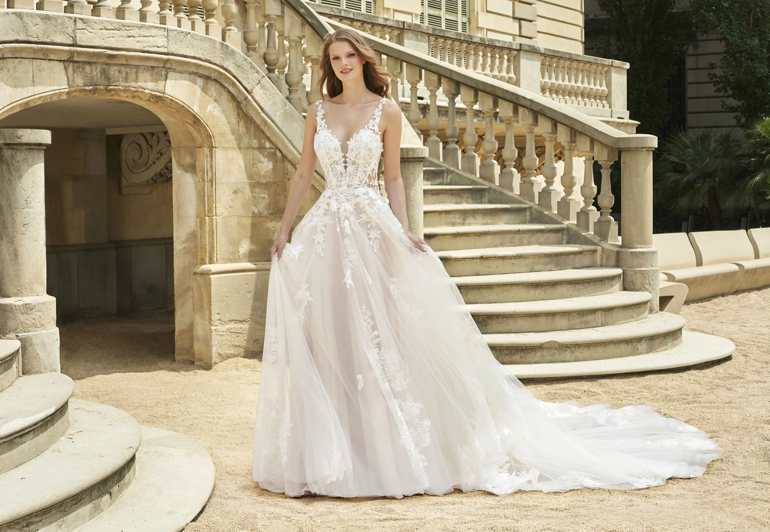 Picture-perfect modern romance. This slim, soft A-line gown features sparkling organic floral lace and spectacular hand-beading at the neckline. Unique side cutouts create a body-contouring shape to balance out the ethereal, flowing skirt that manages to stay light and airy.