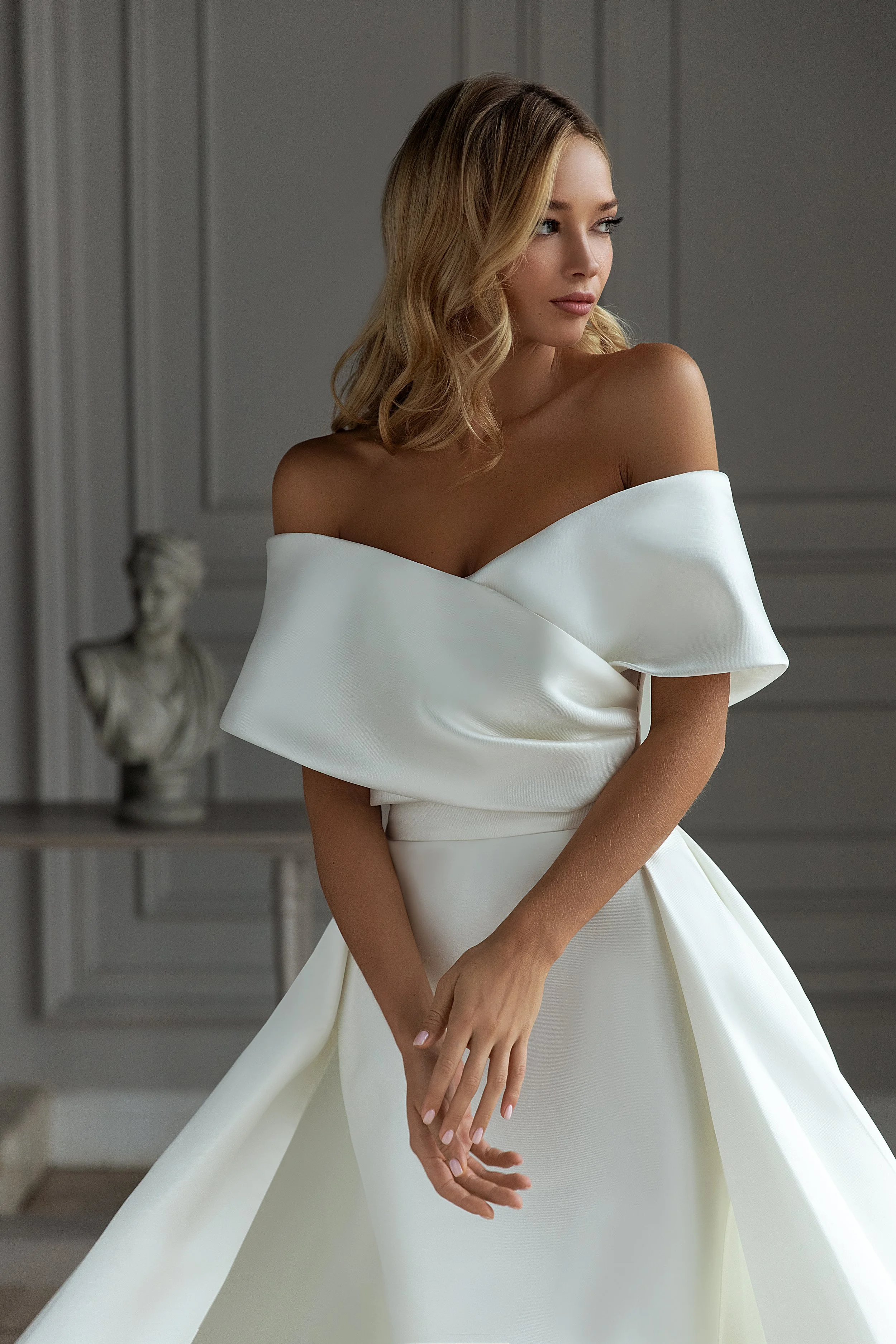Jess is a fabulous mikado wedding dress with an incredible overskirt. She is a sheath dress with lowered over the shouldered sleeves. The exquisite additional overskirt is fixed on the waist and has a beautiful train.