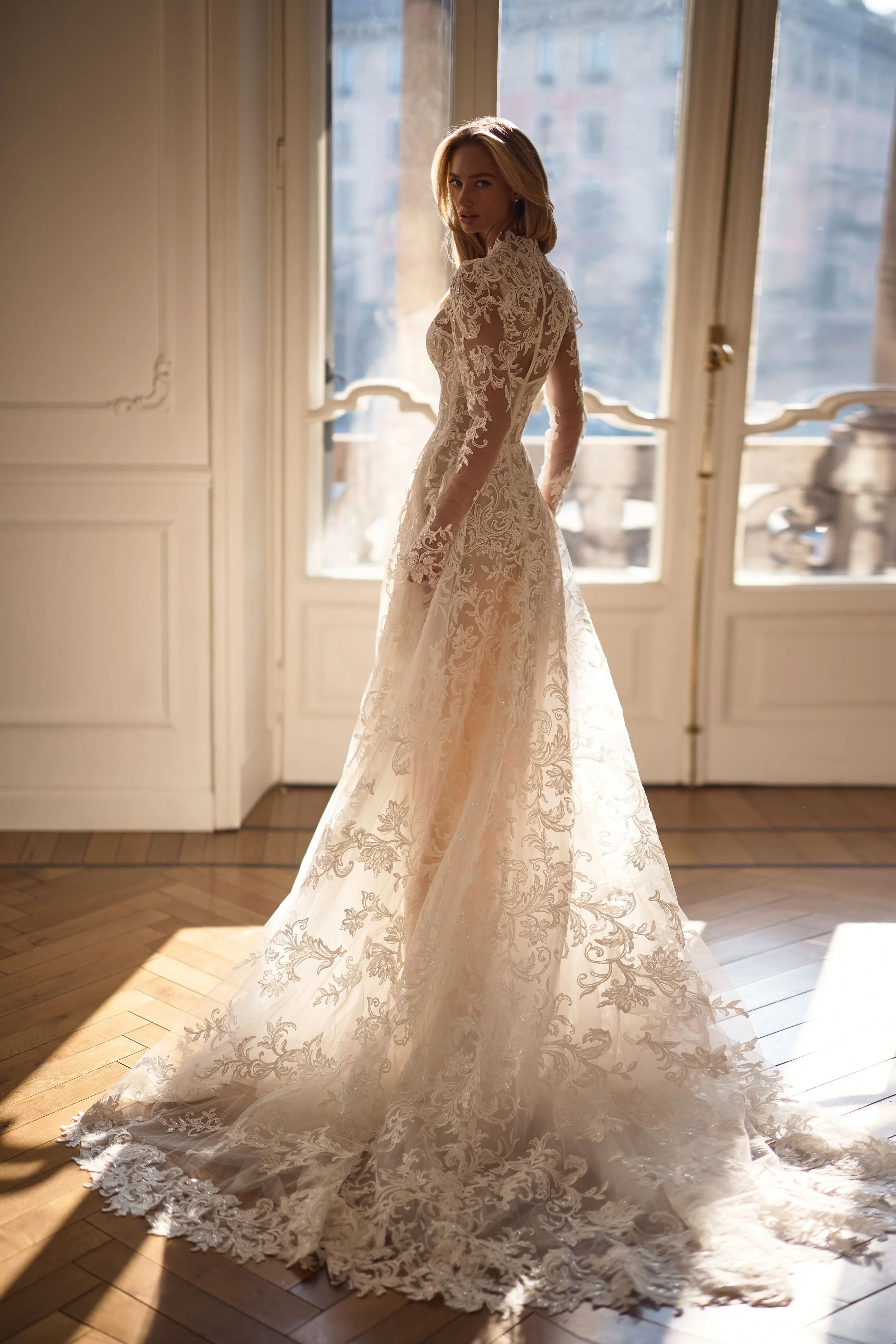 Victorian-era-inspired A-line lace wedding gown with intricate floral ornament. Featuring a plunging V-neckline with a high collar, semi-sheer long sleeves, a structured corset bodice with built-in cups and visible boning, and a closed lace back. The voluminous skirt cascades into a flowing midi train, complemented by a soft nude lining for depth and contrast.