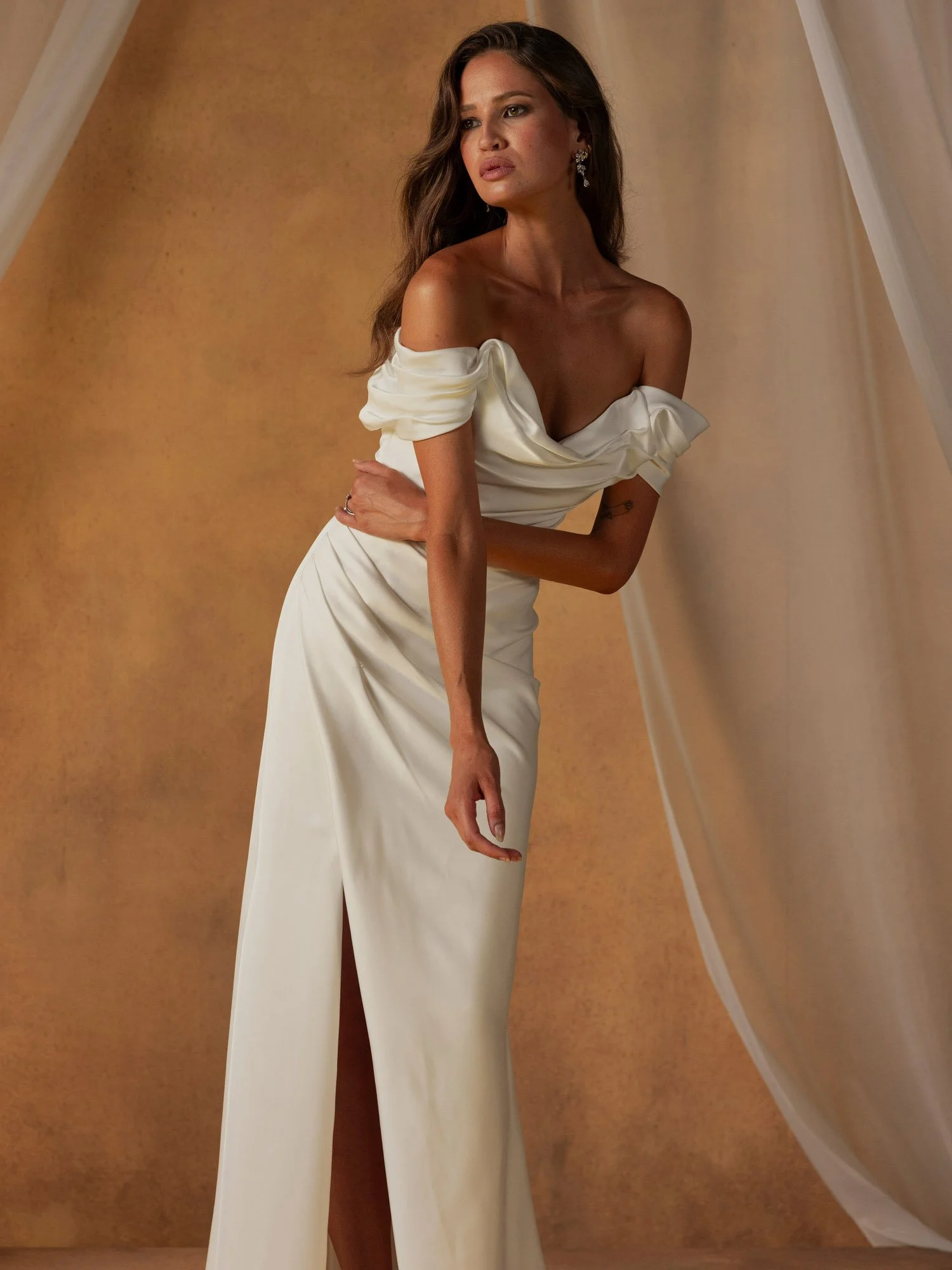 Nelson’s feminine sweetheart neckline drapes at the bust and flows into the off-shoulder sleeves. Echoing the draped detail that continues down the length of the fit and flare dress. Pleats around the bodice draw in the waist, creating movement into the skirt. An asymmetric wrap-style skirt hugs the curves of the body, featuring a leg split that elongates the figure. Luxuriously crafted in smooth slinky satin or clean French crepe, our Nelson wedding dress celebrates the feminine form with opulence. Around the back, Nelson is finished with a shorter train to balance the look. Creating a streamlined, minimalist shape that gives the dress a couture-inspired edge.