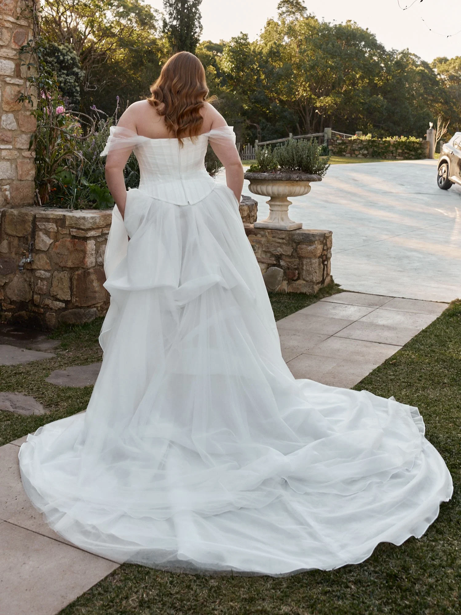 Nickel Bodice and Novella provide a feminine option for unconventional brides. Also available in classic Ivory (our sample is ivory), this bodice is sweet and playful, with modern elements and all the versatility imaginable. The corset-style bodice begins with a scoop neckline. Exposed boning creating shape with a modern edge, layered with blush pleated tulle to soften the design. Finishing at an on-trend rounded drop waist, hugging the figure to the hips for the most desired silhouette. The bodice can be worn contemporary and strapless, or with the detachable tulle off-shoulder sleeves for added romance and delicateness.The back is a classic lace-up characteristic of the corset style.