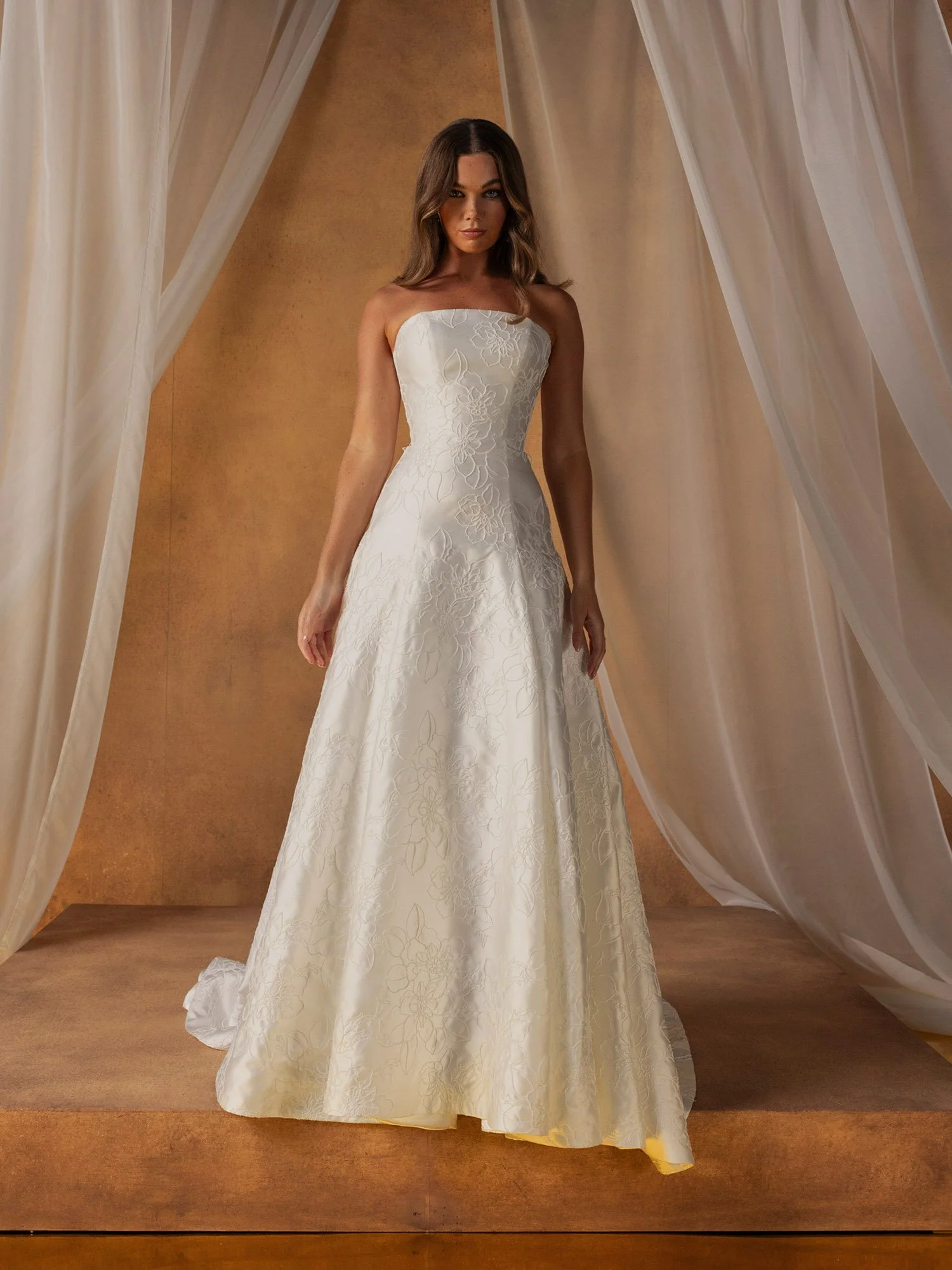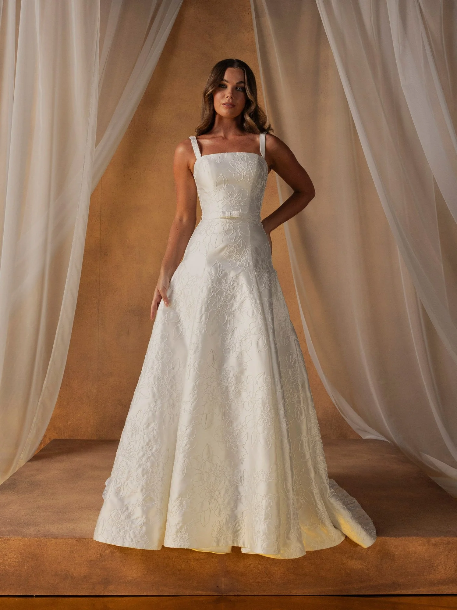 Named for the region of France that inspired the artistic eye of Claude Monet - Normandy wedding dress is artfully comprised of corded Mikado, acting as a clean canvas for subtle details, making this dress the perfect fit for minimalist brides who desire the romance of florals on their wedding day. Normandy balances traditional bridal fashion with modern, slightly abstract details. A classic, straight neckline bodice can be worn strapless, or supported by thicker straps for comfort and security. Through the bodice, princess seams run down and continue through the skirt, elongating the figure. The waist can be further cinched with the inclusion of the detachable bow belt detail. The design skims the waist and hugs the hips, before flaring into a full, luxurious skirt. Softly pleated for additional volume. Around the back, a dramatic, circular train follows behind to create a traditional bridal statement. Finishing the design, a vertical row of buttons lines the back down to the end of the train for a polished, elegant final look.