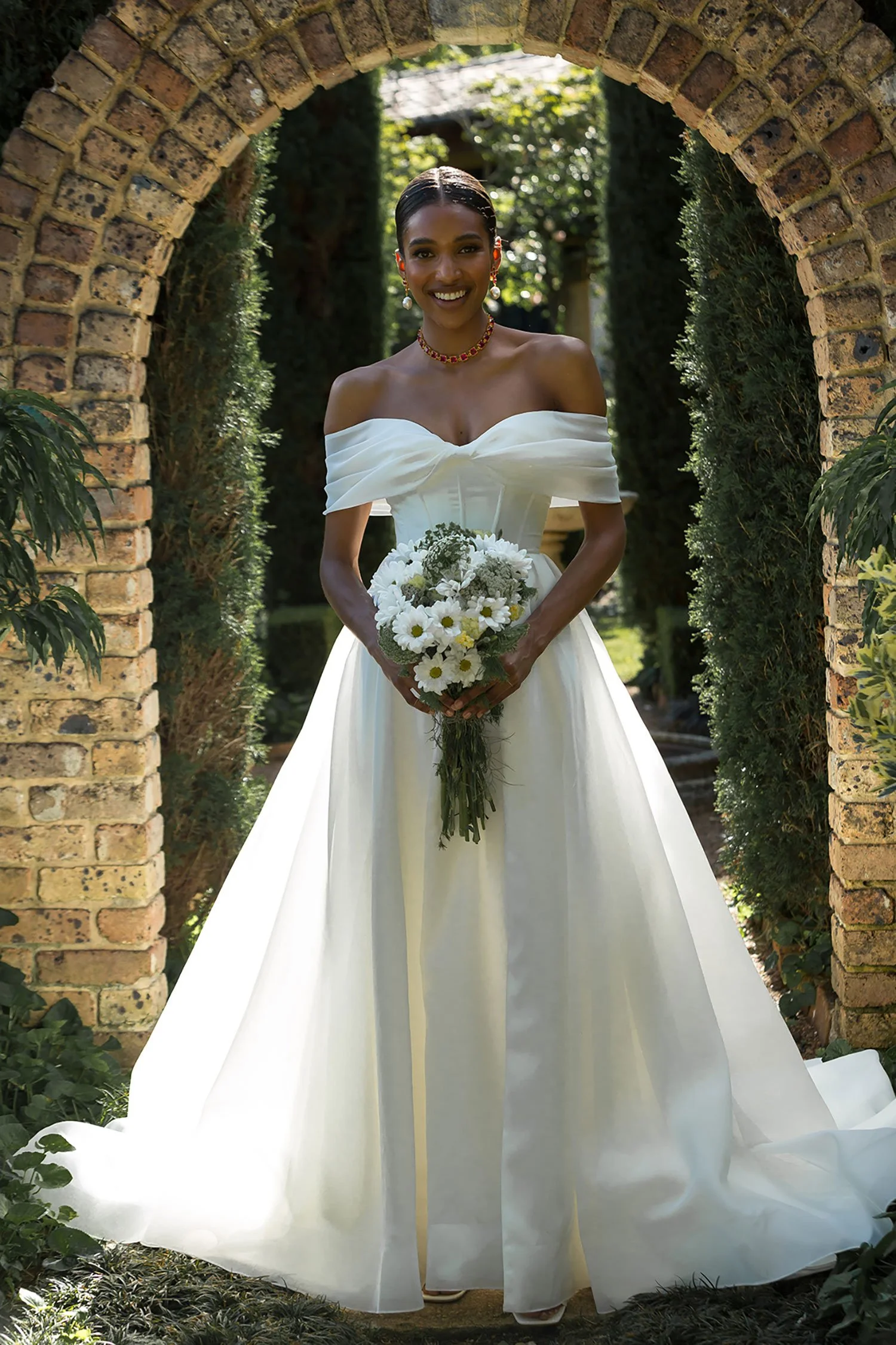 Get lost in Prestyn’s luxurious layers of organza fabric, crafted into a feminine princess A-line silhouette. The softly pleated off-the-shoulder straps continue across the arms which gives natural coverage and style, whilst still maintaining a clean, minimalist design. Modern femininity is held at the forefront of her wedding dress design in her unique bow inspired bust and back detailing. Her modern bodice is completed with expertly crafted boning and a perfect row of fabric-covered centre back buttons to the hem. Her full circle skirt features a left leg split and an impressive cathedral-length train.