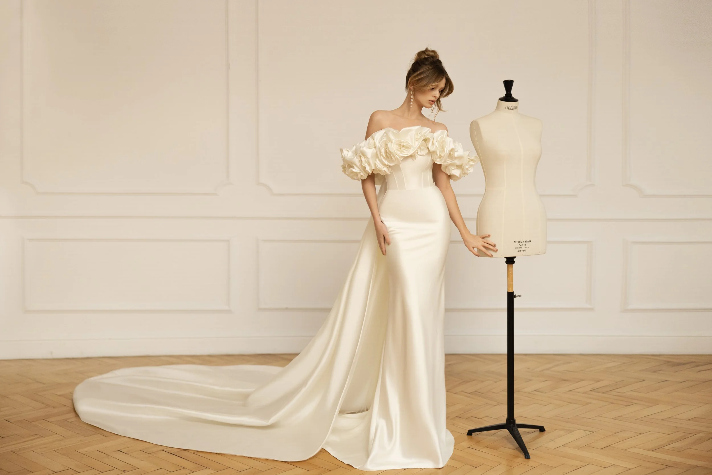 A fit and flare mikado dress that provides a classic look with a modern twist. The highlight of the dress is its removable off-the-shoulder cape made of numerous oversized roses that flatter from the front neckline to the back. Beautiful fitted bodice passes into a butter soft mikado skirt.