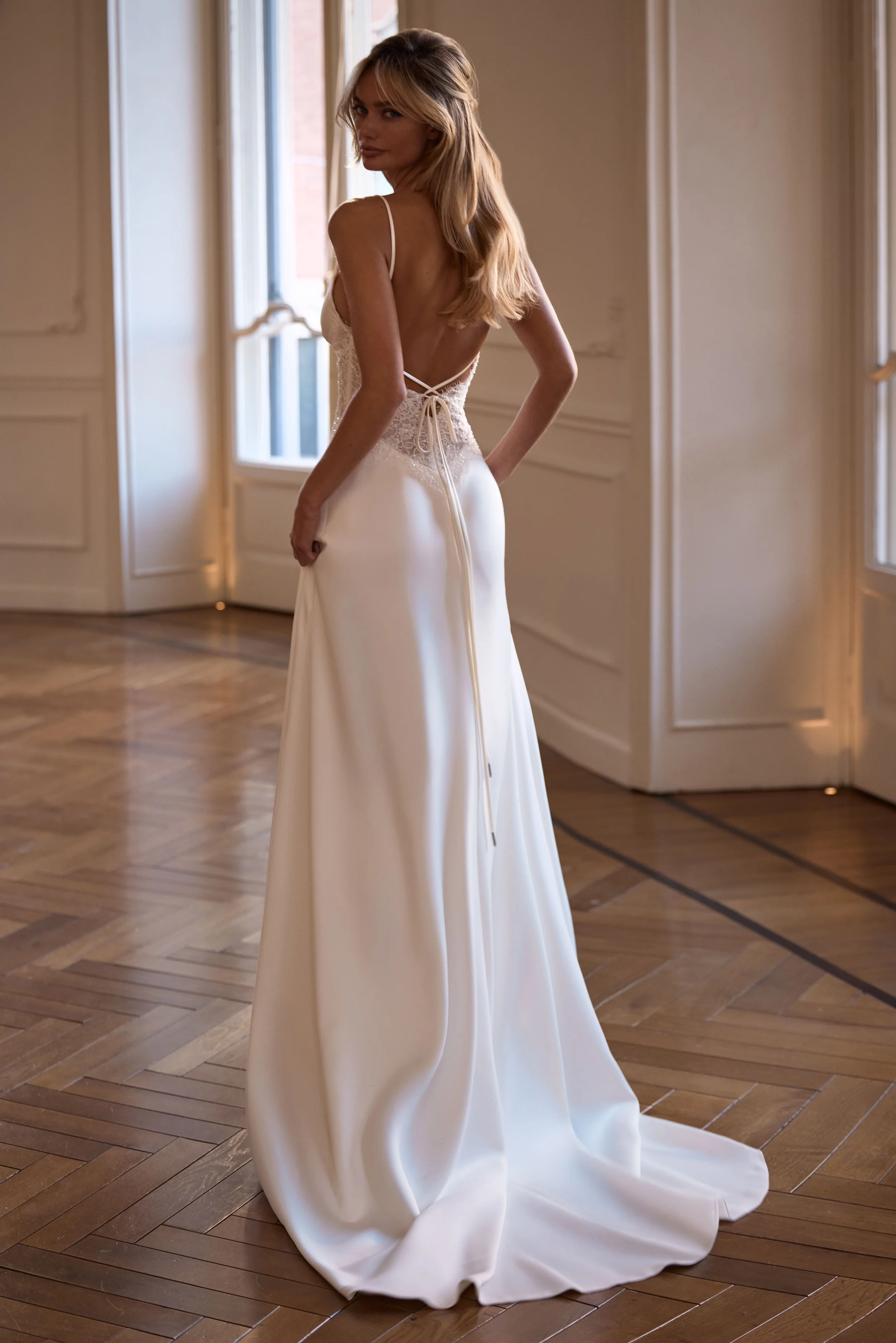 Delicate straight wedding gown cut from a subtle combination of lace and satin. Featuring a V-neckline framed by thin spaghetti straps, a lace corset bodice with intricate floral embroidery, a lace-up closure with thin satin ties, and a relaxed satin skirt. It can also be styled with a Thalassa hairband, an Annelise Illusion cover dress, or an Alouette scarf.